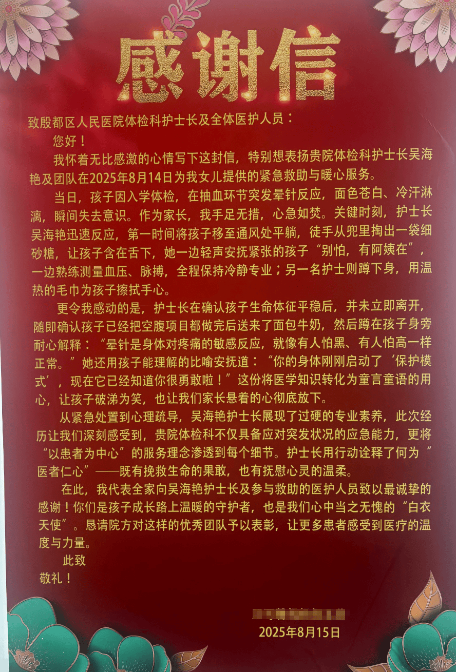 而在健康管理科的墙上,除了刘女士送来的锦旗,一封感谢信也常常吸引着体检者的目光,那是小馨(化名)妈妈特意送来的,字里行间满是对科室医护人员的感激,讲述着一段因 “晕针” 而起的温暖故事。