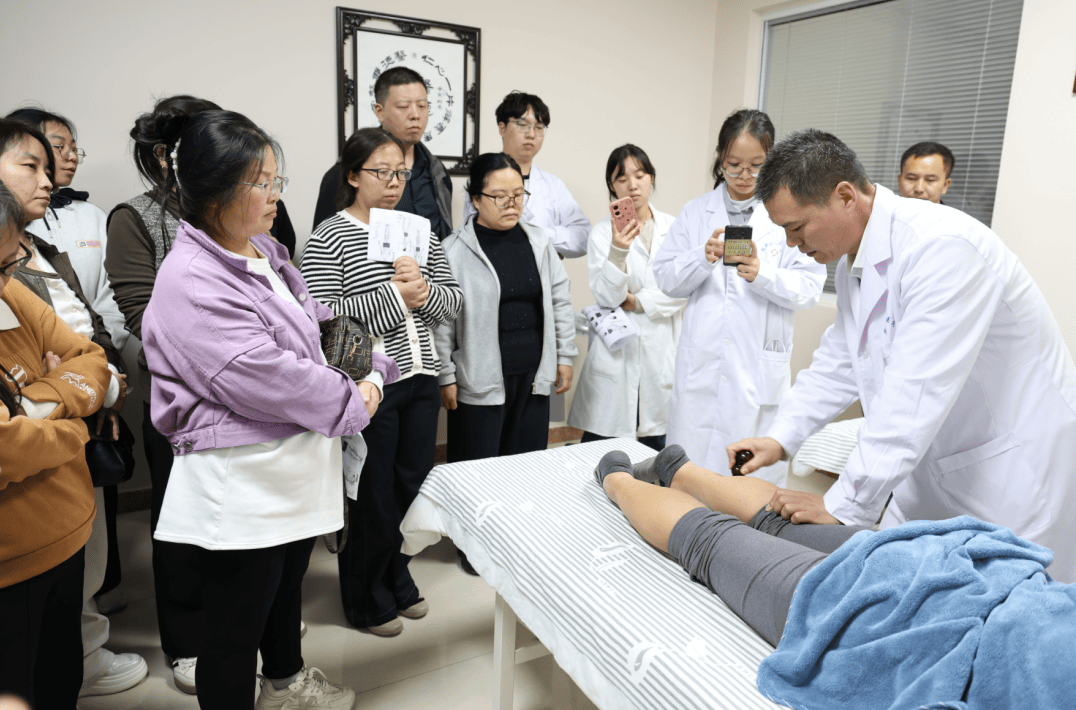 理论讲解结束后,培训转入实操环节。诊室里,张国军老师现场演示了针对疼痛部位的经筋松解与调理手法。他强调“以指代针、以手为药”,通过触诊定位筋结、运用推、按、拨、揉等手法进行松解,配合呼吸引导与体位调整,达到“通则不痛”的疗效。
