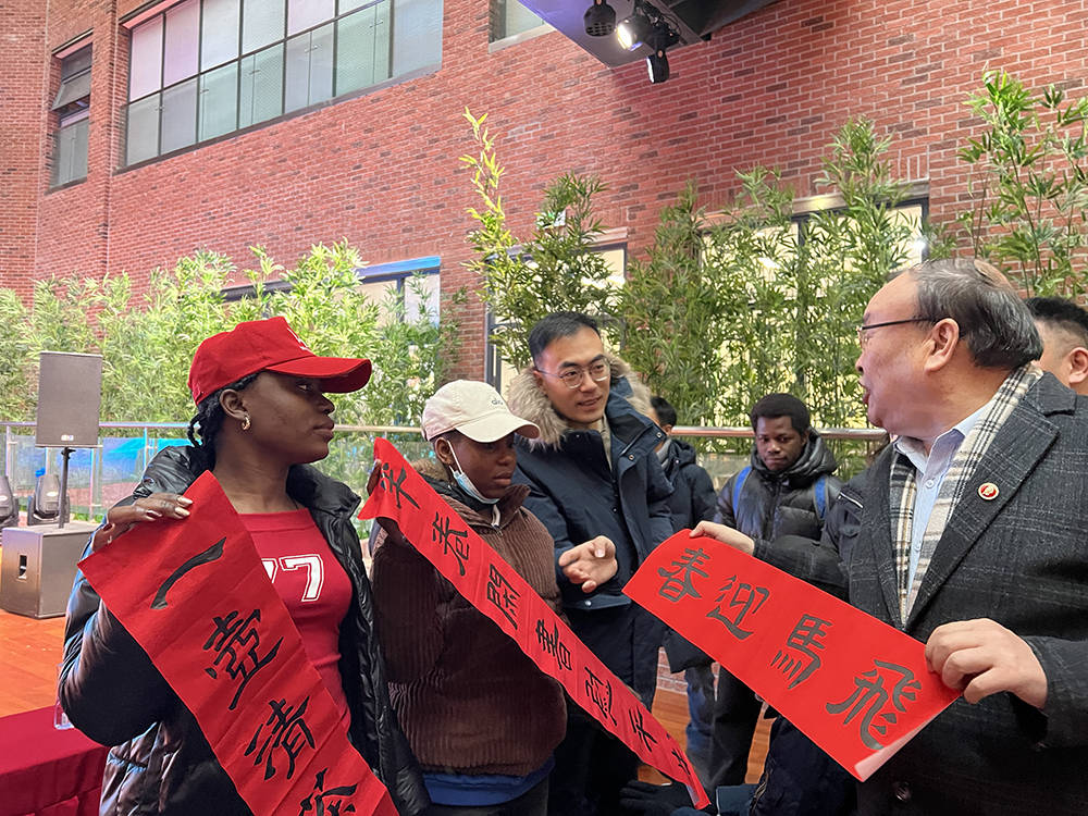 最具有中国人过春节传统文化书法艺术成为全场的压轴大戏。通过长达数十余分钟组织与天津财经大学赤道几内亚、贝宁、泰国等外国留学生和孩子们互动,郦道元文学院签约作家武新才等老师们不仅用精湛的书法当场挥毫泼墨写春联福字,还当场手把手教留学生和孩子们如何写楷、隶、行、草、篆书,普及书法知识和中国传统文化,弘扬传统文化艺术,几名留学生用毛笔写出了福字,当场展示给观众时,全场掌声雷动欢声笑语,把喜迎新年的联欢会推向高潮,送上提前拜年暖暖的中国年味,感受到传统文化艺术美好!