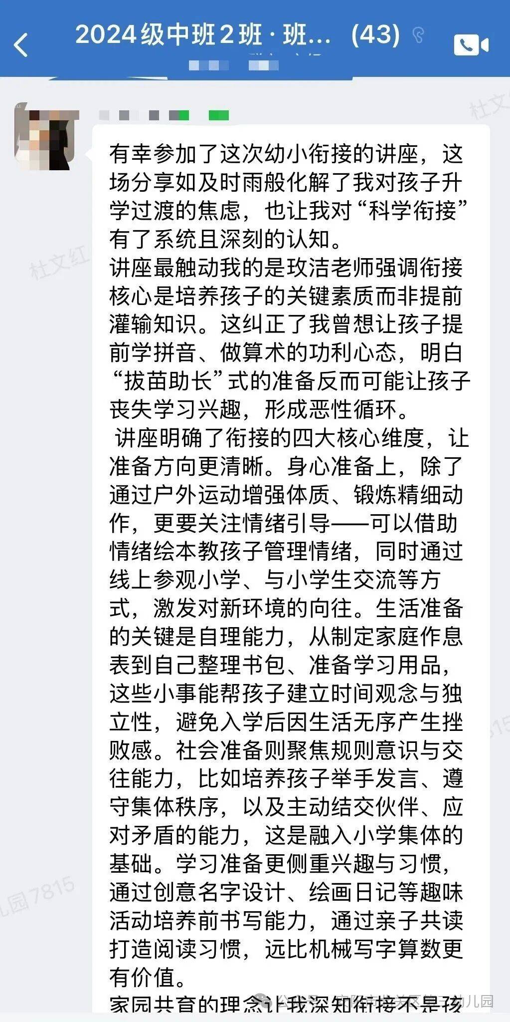 本次活动由我园谢玫洁老师担任主讲,面向全体中、大班幼儿家长,旨在传播科学衔接理念,指导家庭教育实践。