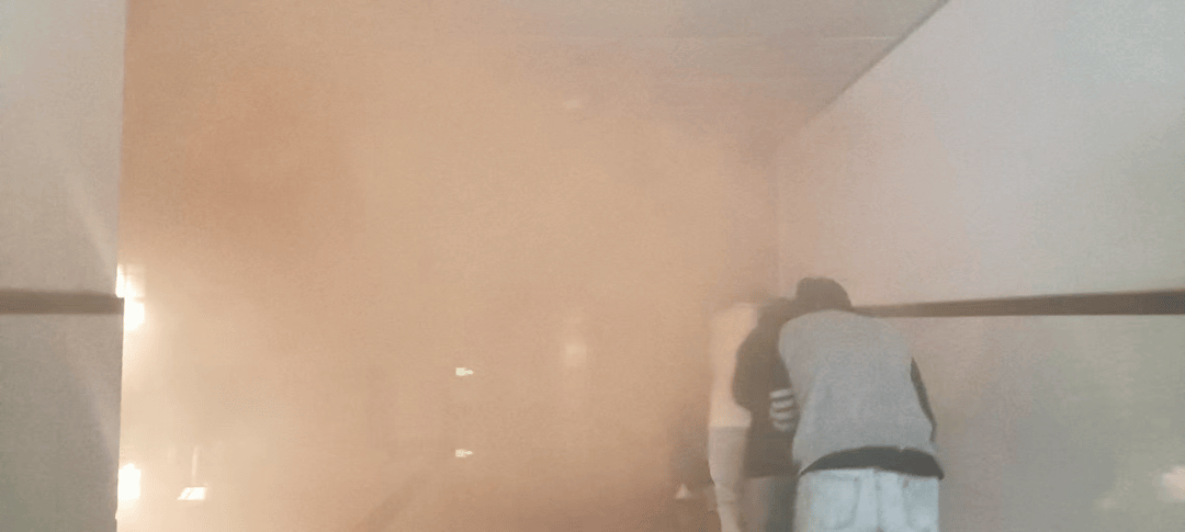 下午4:20,随着急促的消防警报声响起,应急疏散演练正式拉开帷幕。模拟烟雾中,引导员迅速就位,沉着指挥。全体师生严格按照预案,用湿毛巾捂住口鼻,弯腰低姿,沿指定疏散路线快速、有序撤离至安全集结区。整个过程紧张有序、配合默契,达到了预期效果。
