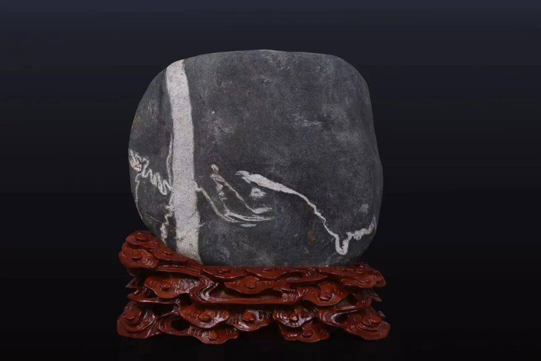 翻转石面,一幅简笔大写意“高山流水”画面映入眼帘。石面左侧,一道白色石筋,通天拔地,直通石顶,如刀削斧劈,又似电闪雷击,成为惊心动魄的断壑石瀑。石筋左侧是白色曲线纹理勾勒而成的绵延群山;石筋右侧则是白色线形纹理勾勒而成的远山近河。危峰断壑之下,湍急的河水奔流而下,河畔一位身披长袍、头戴苇笠,神态安然的老者正驻足远望。整个画面深邃悠远,格调高雅,山水、人物、景物均以简笔勾勒,线条老辣,力透纸背,宛若北宋马远再世,以泰山为绢,以岩浆作墨,将山的刚毅与水的柔情镶嵌于石面之中,充满着意境美与禅意美。
