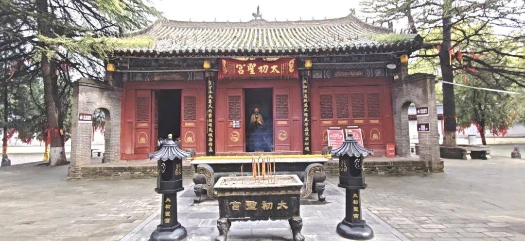 想着想着,我们已穿过松柏蓊郁的道家广场,来到宁静神秘的太初圣宫前。这座宫殿坐北朝南,为三间砖木硬山庑殿式结构,与景区内其他“高大上”的仿古建筑相比,虽然显得矮小、简陋,我却对它情有独钟。因它的诸多建筑构件源自唐、元、明、清各代;宫脊与山墙檐边,黄绿琉璃狮虎麒麟等瑞兽,或蹲或伏、呼之欲出;建筑风格寓道教特色于历代营造技艺之中,堪称中国北方古典建筑演变的“活化石”。更重要的是,传说老子骑青牛过关时,被望见紫气浮关、料有圣人将至的关令尹喜苦苦挽留,在此居住半年有余,写下洋洋五千言的传世经典《道德经》。这座小小的太初圣宫,无疑是《道德经》诞生的“产房”,亦是道家思想与道教文化的源头和地标。还有,前文所述唐玄宗与“灵符”的离奇故事,亦发生在眼下我脚踏的这片方寸之地上。于是,在我眼中,这座古朴的圣宫渐渐化作一部凝固的立体史书,每一道砖缝、每一处瓦隙,似乎都藏着无尽的历史密码。