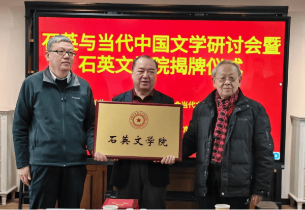 李正忠名誉会长(右)、祝东力顾问(左)共同为“石英文学院”揭牌,冷雪松常务副院长(中)接牌