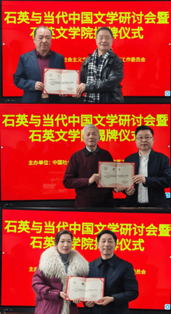 授聘仪式上,李正忠名誉会长和祝东力顾问共同为“石英文学院”揭牌,冷雪松接牌。鲁太光会长为顾问李正忠、祝东力、曾凡华、易运和、朱金平颁发了聘书;李正忠名誉会长为石英名誉院长颁发了聘书,曾凡华顾问为冷雪松常务副院长颁发了聘书,易运和顾问为周强副院长兼秘书长颁发了聘书,朱金平顾问为王丹副秘书长颁发了聘书。