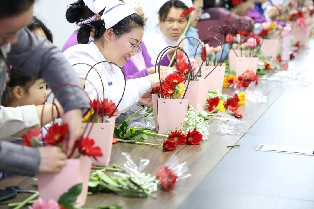 活动现场花香馥郁、暖意融融。专业花艺老师现场授课,细致讲解插花技巧、色彩搭配与花语寓意,手把手进行示范教学。女职工们认真聆听、踊跃尝试,平日里坚守在医疗一线的“白衣天使”,化身心灵手巧的花艺创作者。